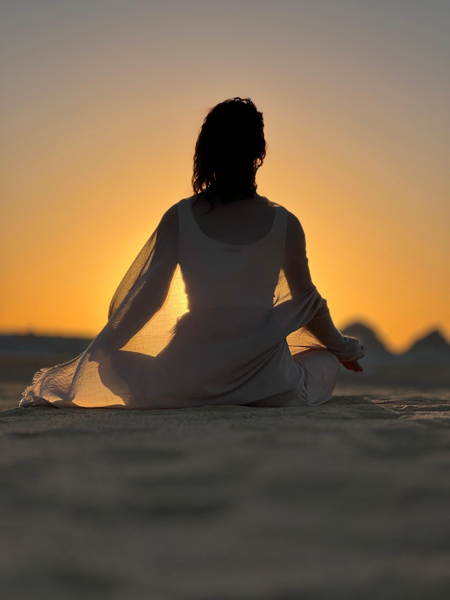 Praxe na terase hotelu s výhledem na pyramidy v Gíze. Jemné, vědomé a iniciační naladění.
